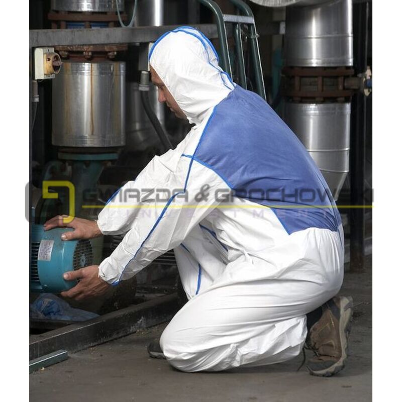 Kombinezon ochronny typu 5 i 6 z materiału laminowanego folią mikroporowatą z gwarantującym komfort oddychającym płatem z tyłu i lamowanymi szwami.