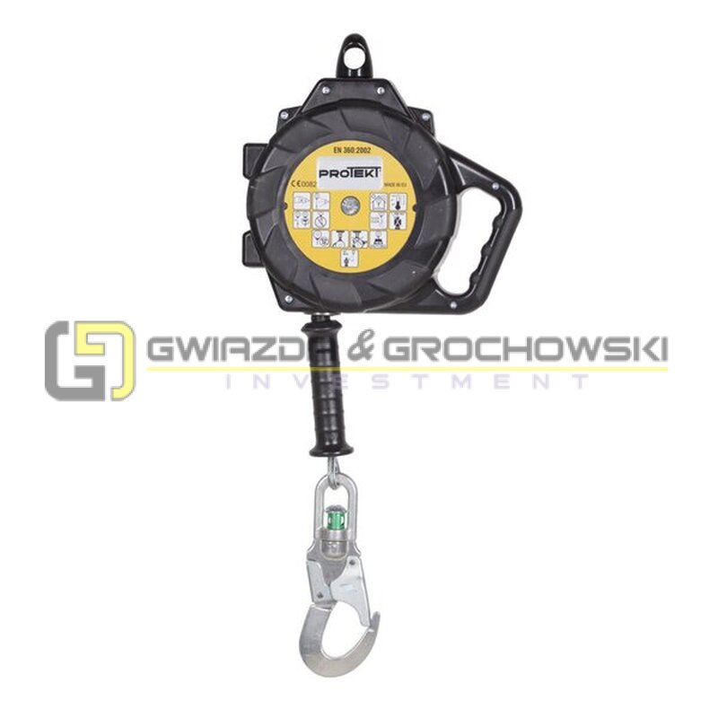 - Urządzenie samohamowne CR 250V do pracy w pionie w obudowie z tworzywa sztucznego z rozwijaną liną stalową oraz krętlikiem wmontowanym w obudowę.