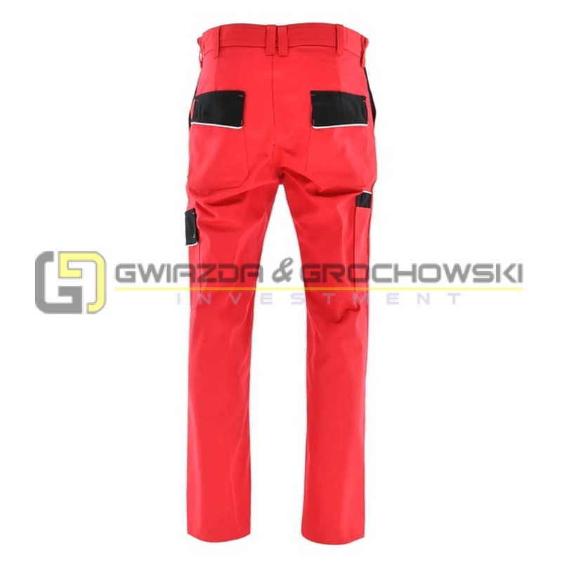 - dwie kieszenie tylne, kryte patkami z tkaniny kontrastowej, patki wykończone lamówką i mocowane ryglami