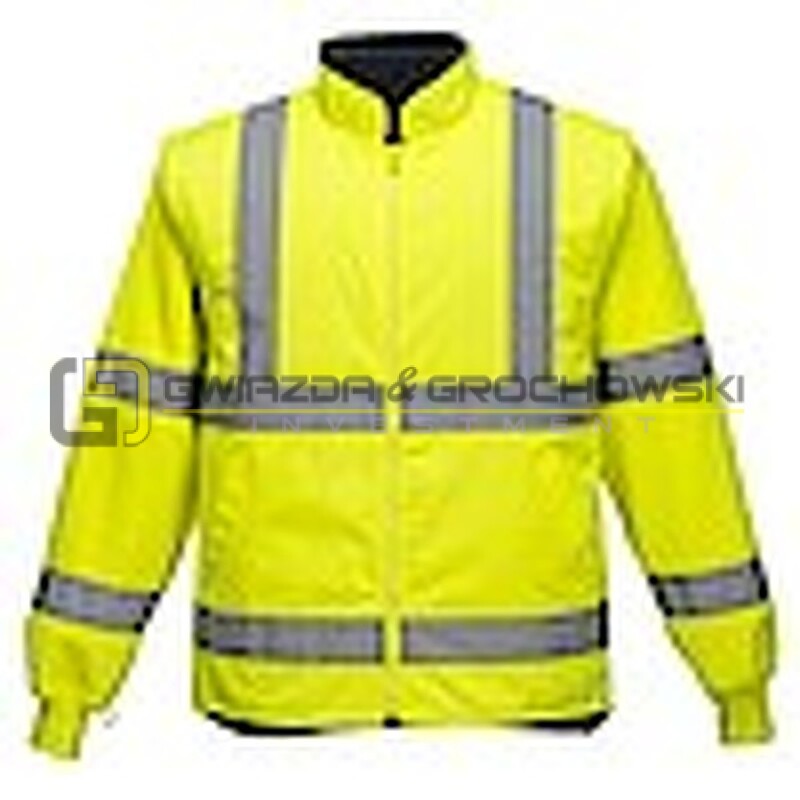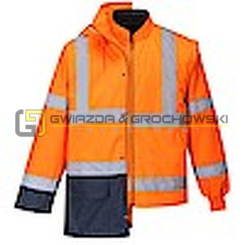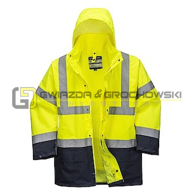 - Wodoodporna kurtka wewnętrzna cechuje się fluorescencyjnymi, odpinanymi rękawami, dwoma kieszeniami oraz kontrastowymi panelami kolorystycznymi, chroniącymi przed brudem