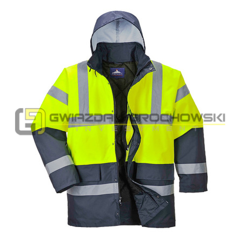 - Lekko ocieplana ostrzegawcza kurtka dwukolorowa Hi-Vision. Posiada kaptur chowany w kołnierzu i wodoodporne, taśmowane szwy.