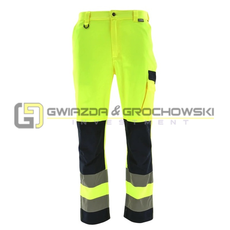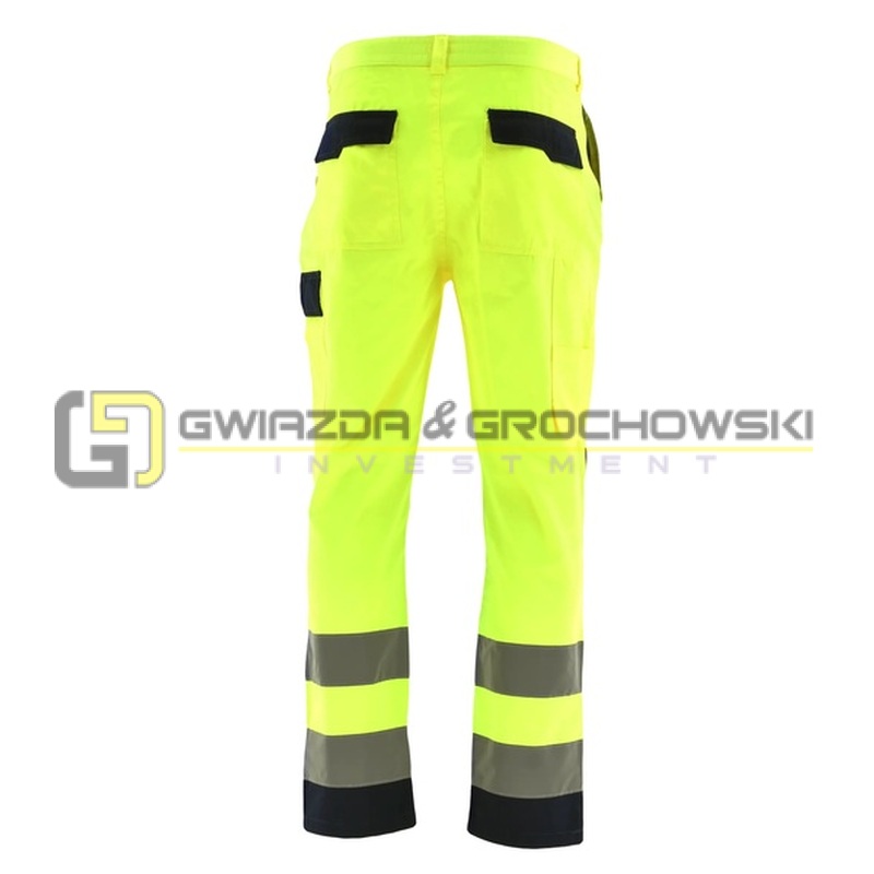 Spodnie robocze wykonane z wytrzymałej tkaniny o składzie 60% bawełny / 40% poliestru i gramaturze 245 g/m². Połączenie materiałów gwarantuje trwałość, wygodę i odpowiednią przewiewność, a zastosowane elementy ostrzegawcze zapewniają lepszą widoczność użytkownika.