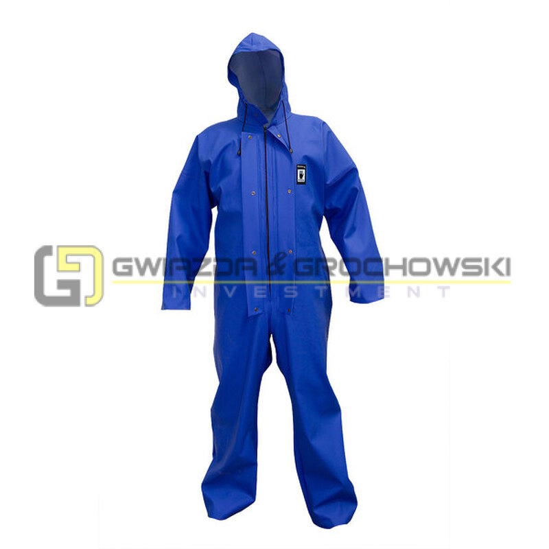 - Kombinezon zapinany na zamek przykryty plisą, z kapturem i wiatrołapami w rękawach i nogawkach.