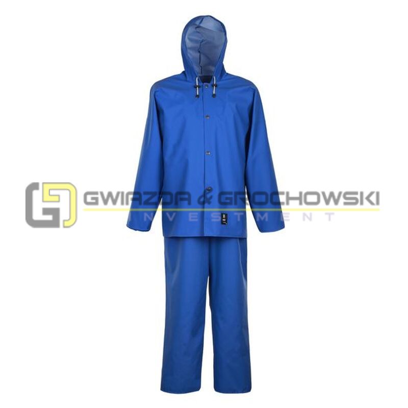 - Ubranie złożone z kurtki z kapturem zapinanej na napy oraz spodni ogrodniczek z regulowanymi szelkami z elastyczną, szeroką gumą z tyłu.