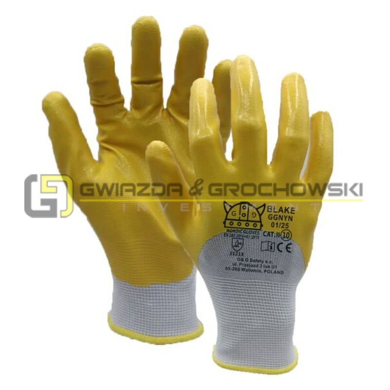 - nylonowe rękawice robocze powleczone do wysokości połowy dłoni żółtym nitrylem