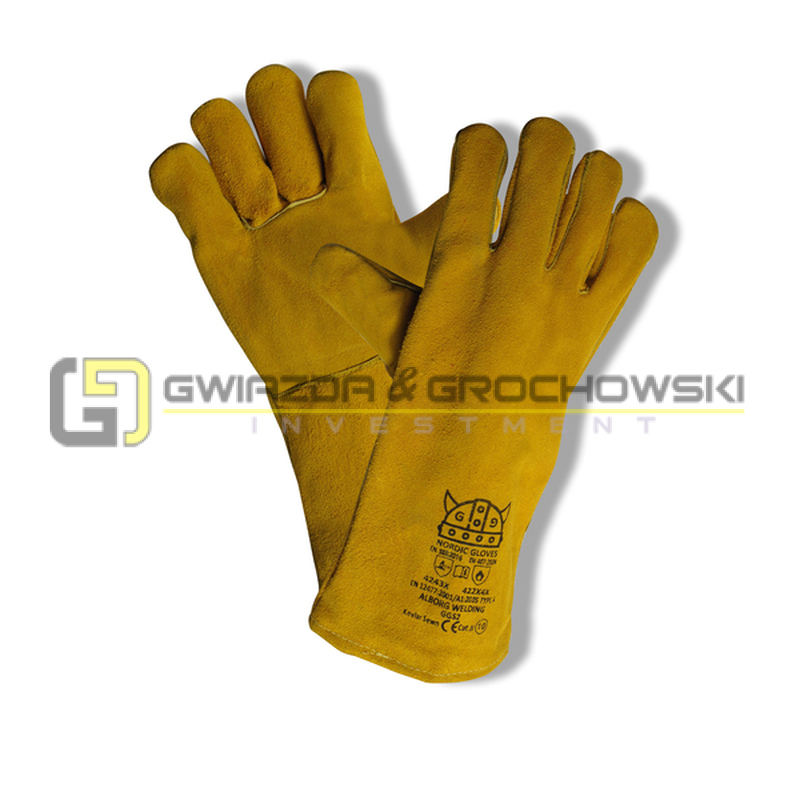 - Pięciopalcowe rękawice wykonane z dwoiny bydlęcej w kolorze żółtym.