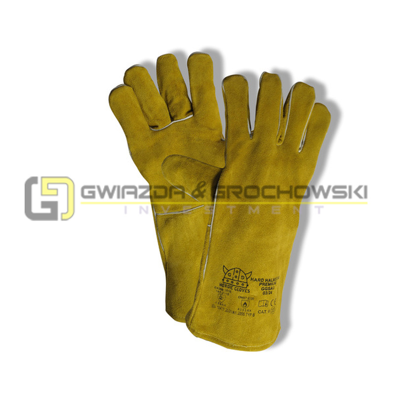 - Pięciopalcowe rękawice wykonane z dwoiny bydlęcej w kolorze żółtym.