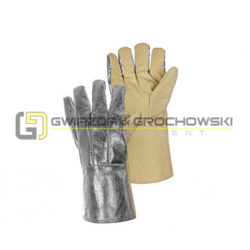 - materiał: dłoń - włóknina aramidowa, grzbiet i mankiet pokryto folią aluminiową