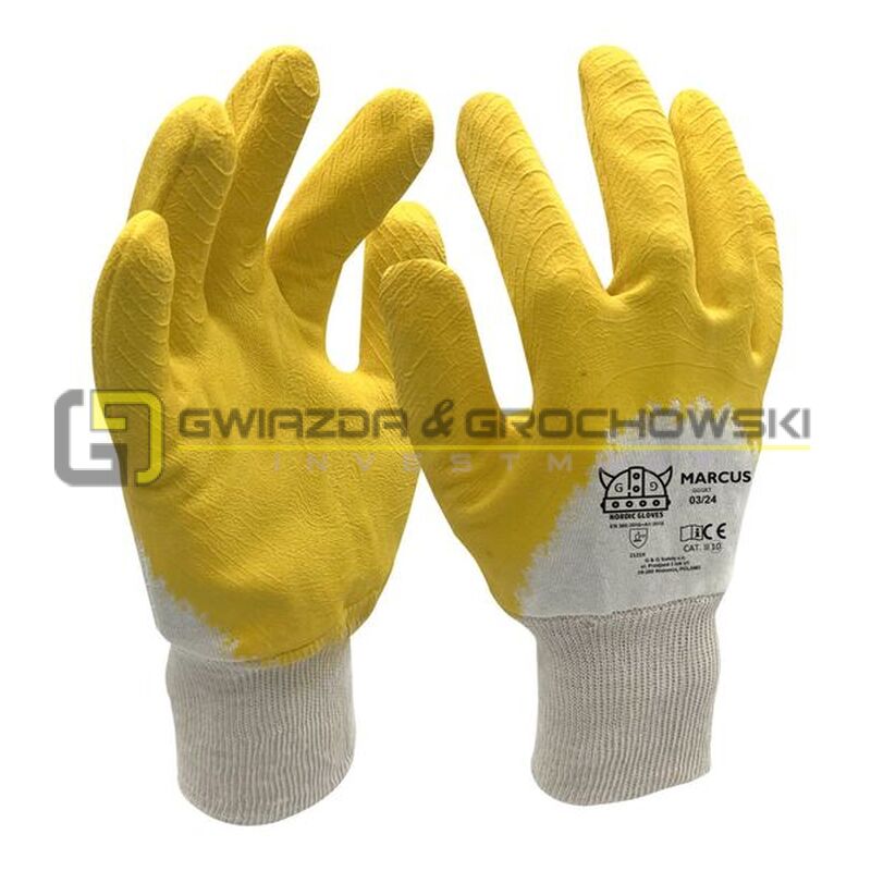 - Rękawice ochronne wykonane z dzianiny powlekanej szorstkowaną gumą w kolorze żółtym.