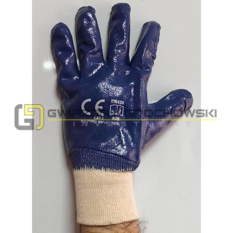 - Część chwytna i wierzchnia oblewane powłoką z nitrylu w kolorze granatowym, odporne na ścieranie, przetarcie czy też przebicie,